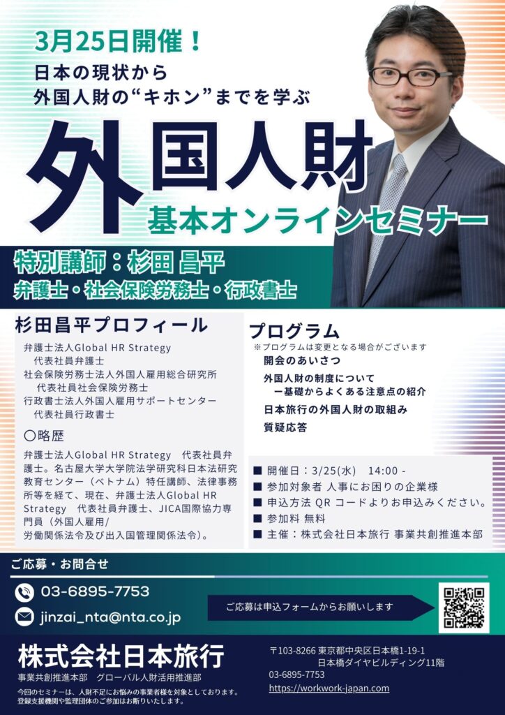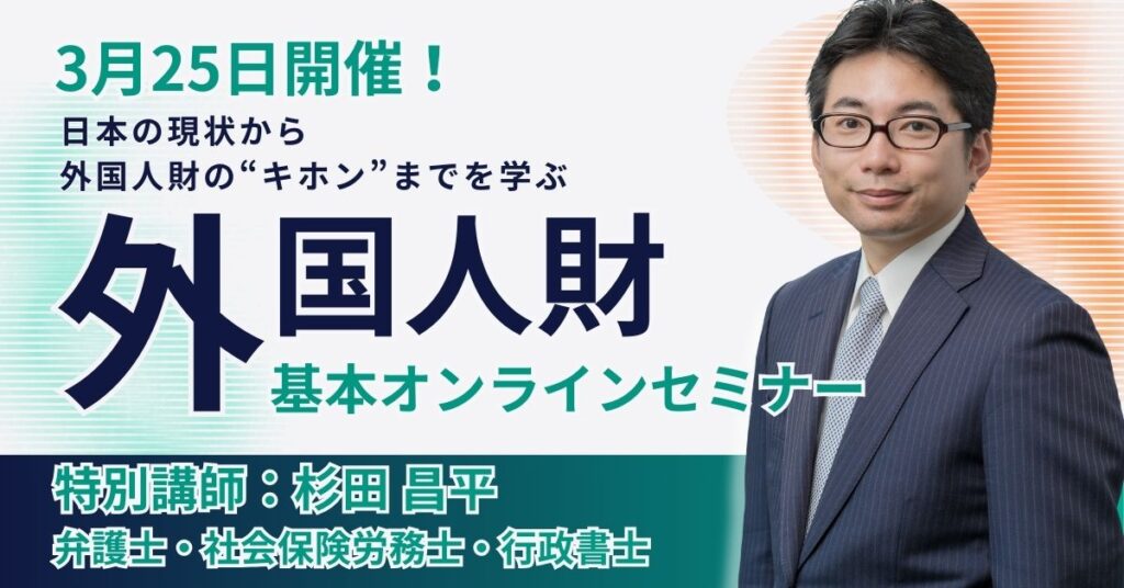 本セミナーでは、外国人雇用の法務・労務の第一人者である杉田昌平弁護士が登壇。新たに新設される「育成就労制度」の最新動向から、現場でありがちなトラブル事例、そして企業を守るための「正しい在留管理の仕組み化」まで、実務に直結する必須知識を分かりやすく解説します。